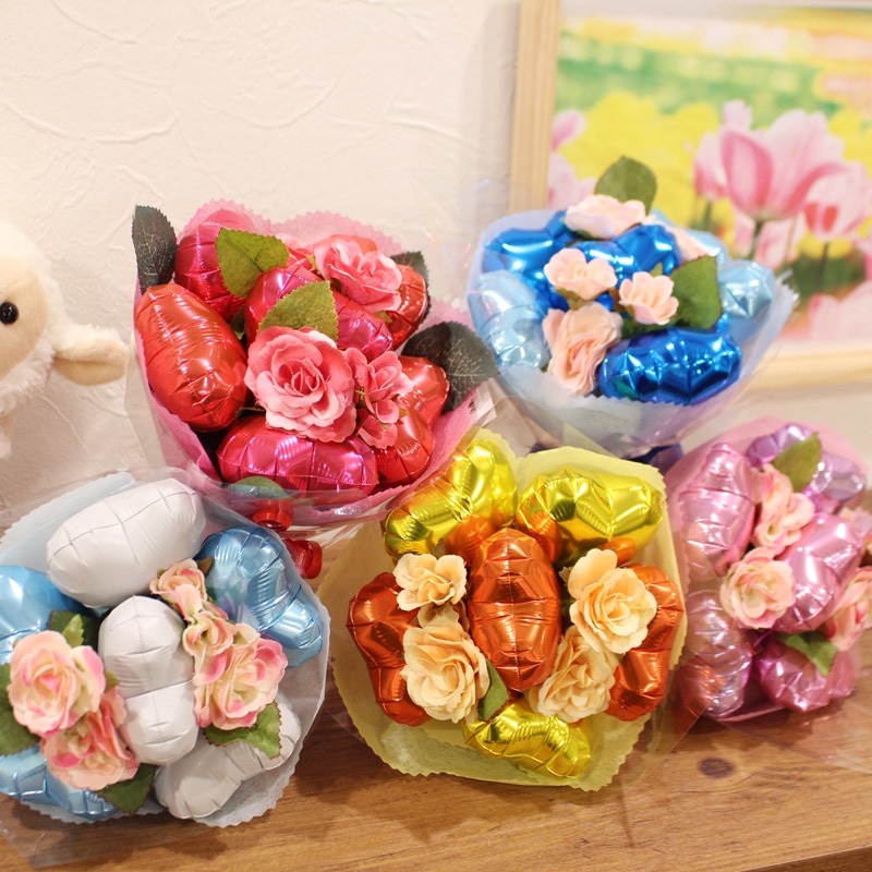 大きすぎずかさばらず、さっと渡せる小さめサイズのバルーンのブーケです♪ メッセージは特に入っていないので卒園のお祝い用、お世話になった先生への贈りものとして結婚式に受付などの飾り、発表会やお誕生日、その他ちょっとしたプレゼントにどうぞ!色のパターンが5色からお選びいただけます。