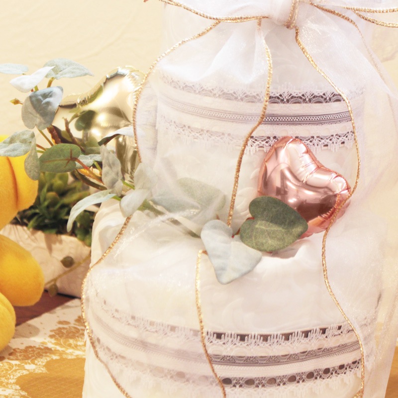 この商品はSサイズのオムツ20枚を束ねてタワー型にしています。タワーの上にバルーンアレンジメントを載せています。