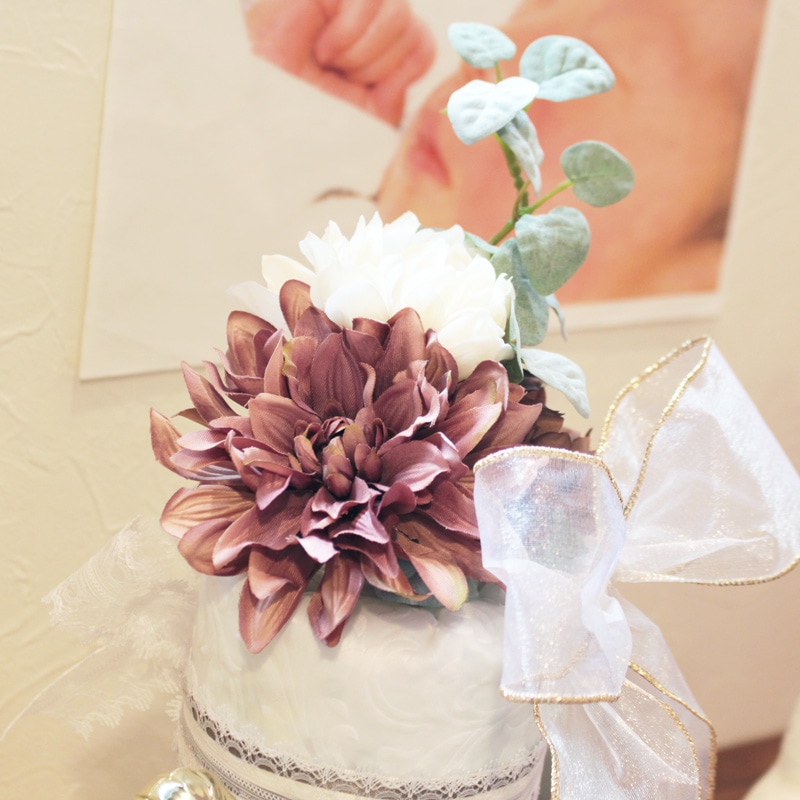 使用しているお花は一部商品を除き全て造花です。季節により、予告なく色・種類・形が変更になる場合があります。写真と同じお花がご用意できない場合は、出来る限りイメージと合うように似た造花を使用して制作いたします。予めご了承ください。