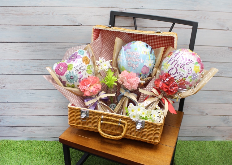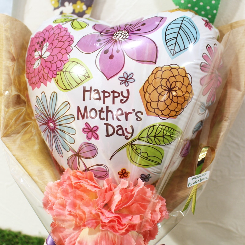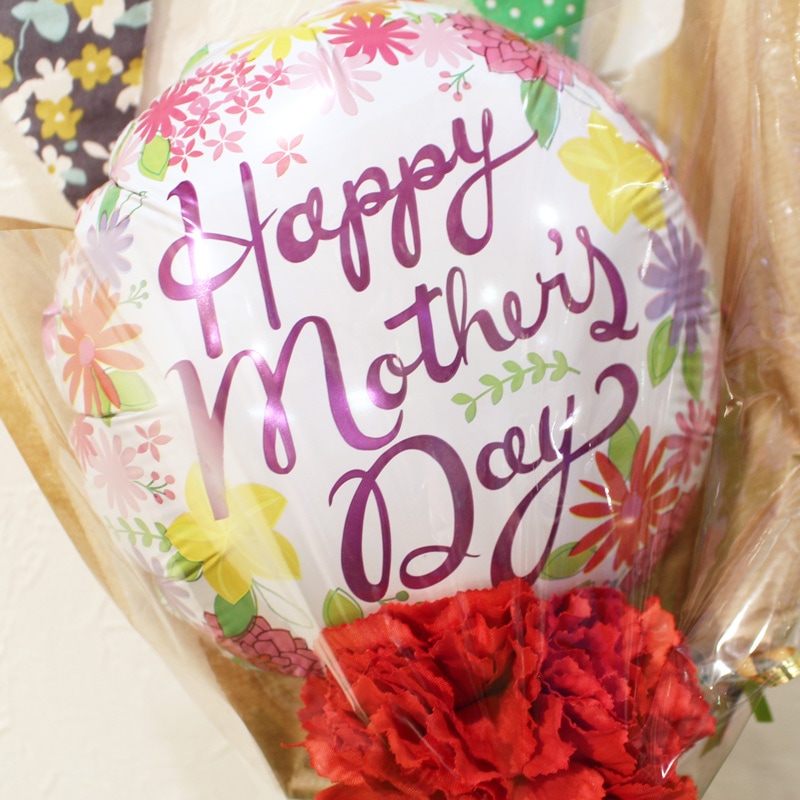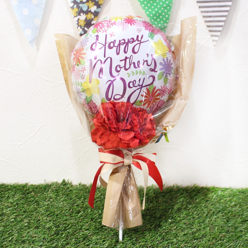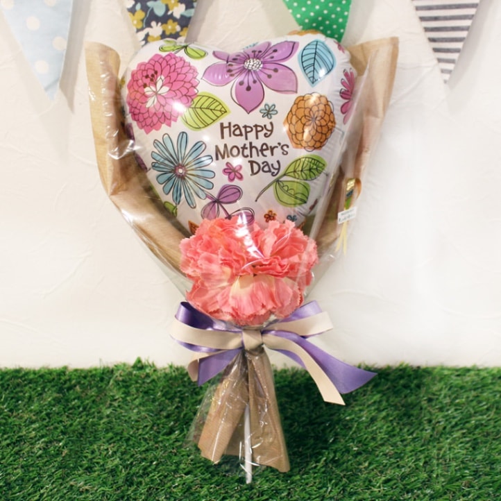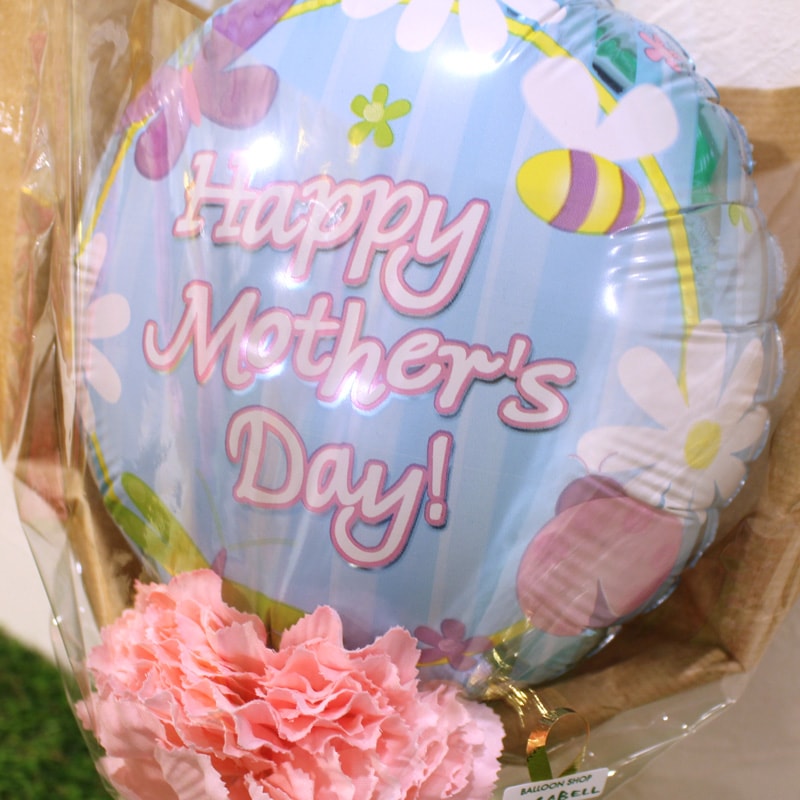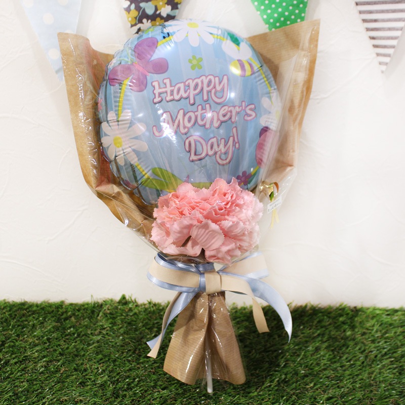 バルーンとカーネーションをひとつずつ組み合わせたシンプルでオシャレなアレンジ恥ずかしく照れるけど、気持ちを伝えてね♡お手頃価格の母の日花束です!