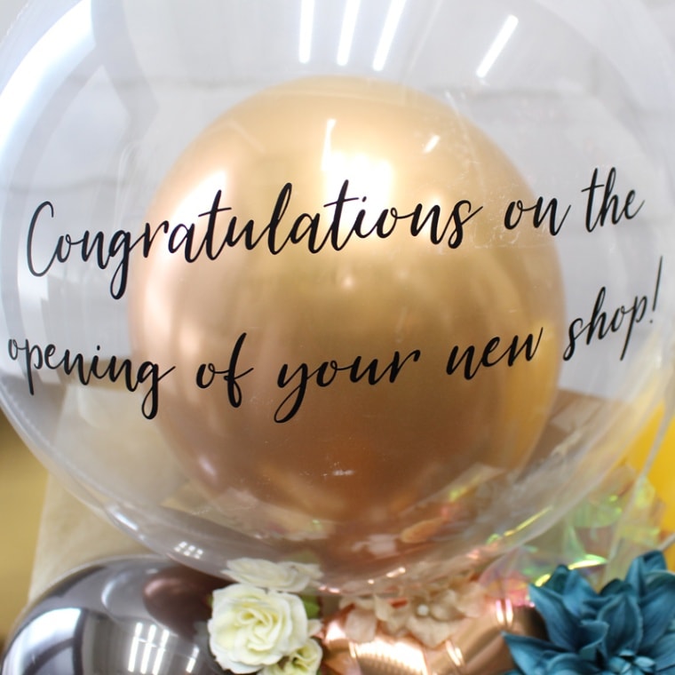 透明なバルーンにCongratulations on the opening of your new shop!(新店舗開店おめでとうございます)の文字が入っています。変更も可能です。変更希望の場合は備考欄にご記入ください。