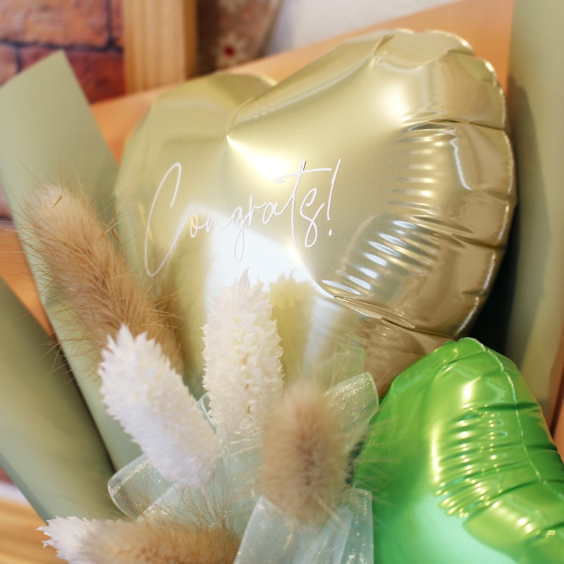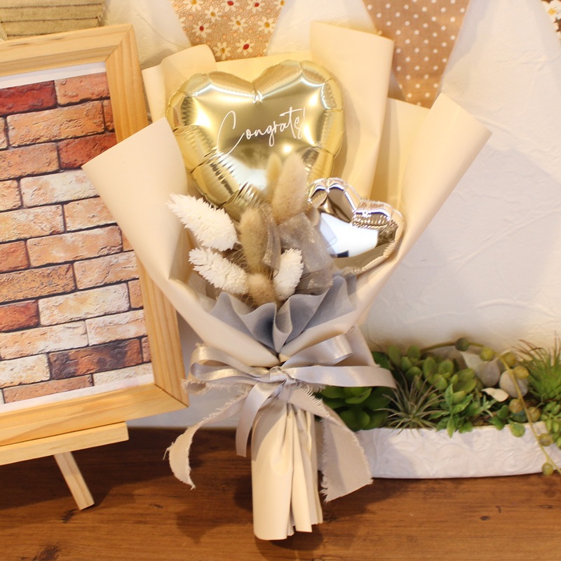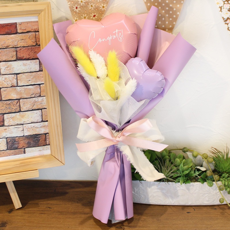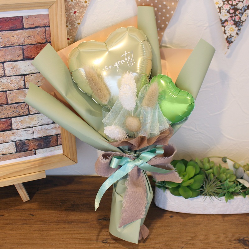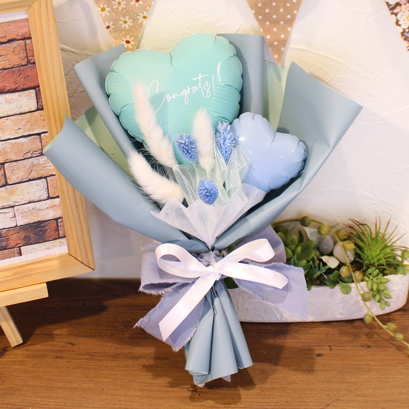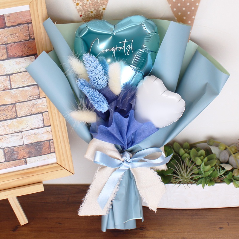 時間の経過とともに少しずつ空気が抜けてきますが、ラッピングしたまま直射日光を避けて飾っていただけますと1ヶ月~数ヶ月もちますよ!